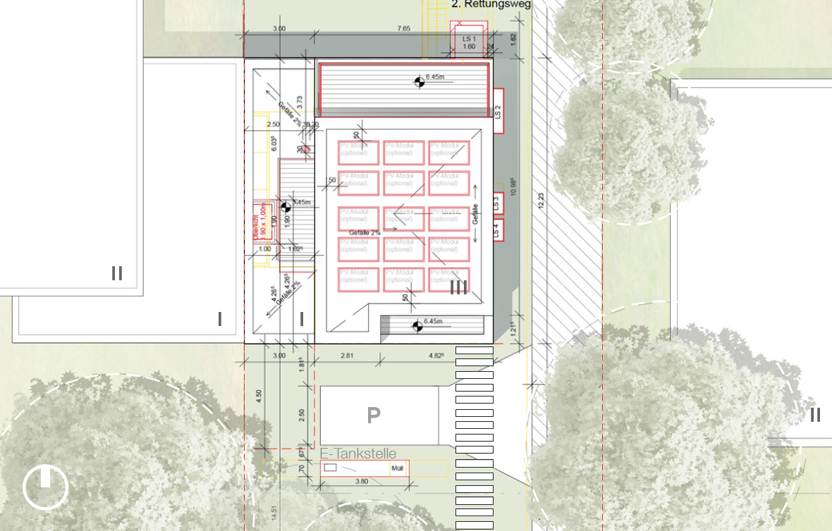 The last design of another architectural office was spatially upgraded and structurally streamlined by revising the passageway, the supporting structure, and the facades. The over-long rows of windows were replaced by a perforated facade and supplemented by wooden elements such as slats and facing shells. The entrance is now accentuated by an undercut. By changing the floor plan on the ground floor, the space around the core can be accessed directly and circularly.. The second escape route from the basement is now solved via a ladder in a light shaft instead of a large ramp in the garden.